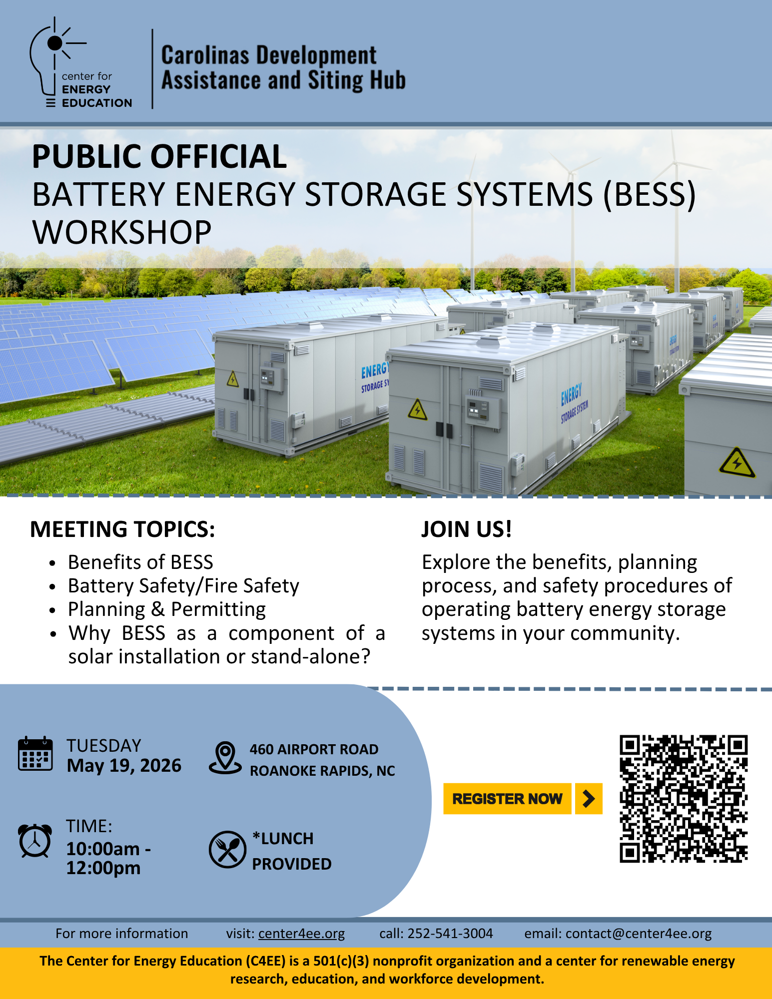 🔋 Battery Innovation Center Workshop: BESS 101 🔋 Join the Center for Energy Education and the Carolinas Development Assistance & Siting Hub for an introductory workshop on Battery Energy Storage Systems (BESS). This session will explore how battery storage supports energy resilience, safety, and community planning. POSTPONED UNTIL FURTHER NOTICED📍 460 Airport Road, Roanoke Rapids, […]
